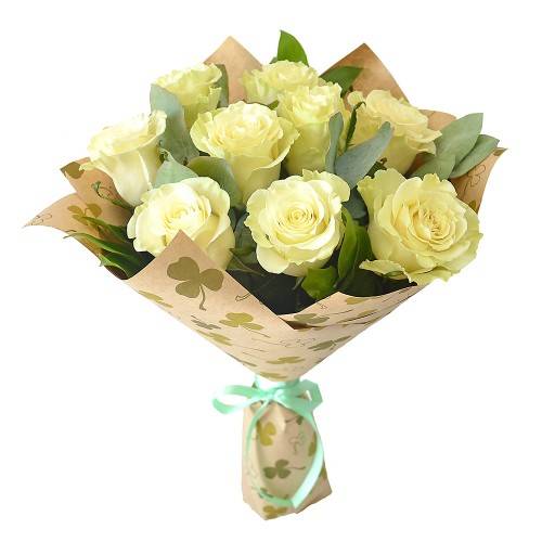 9 белых роз, зелень, упаковка, лента. Высота 60 см, Диаметр 20-25 см